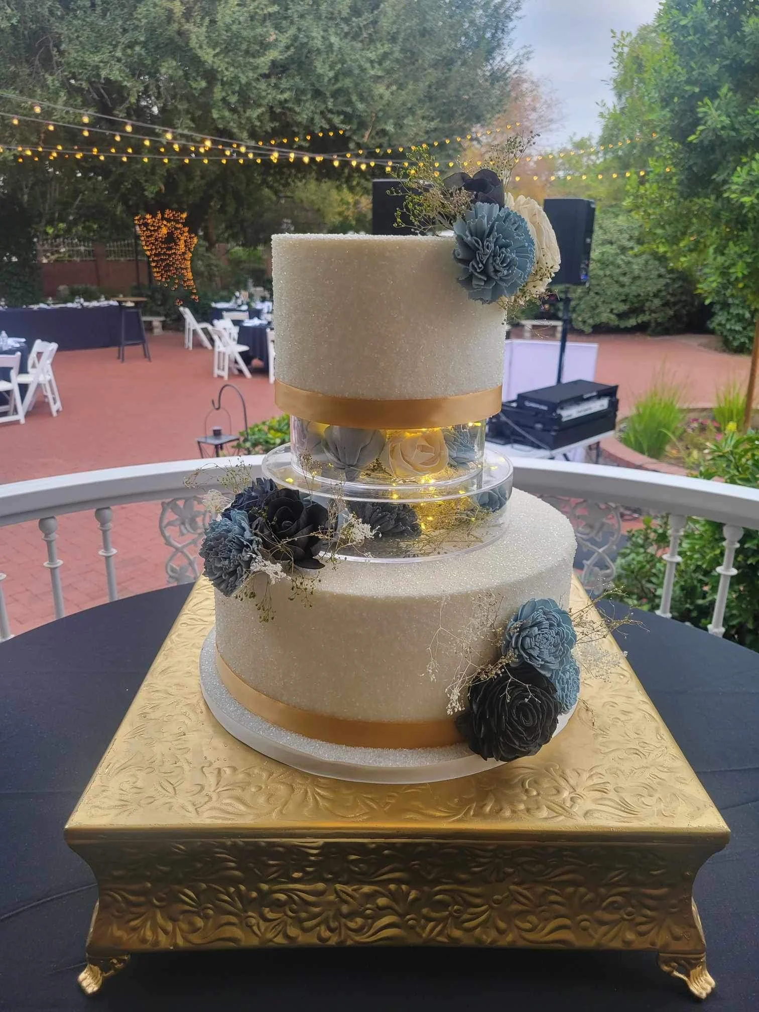 Each cake can be sized with the appropriate number of tiers for every wedding. Toppers, flowers, fruit, brooches, extra fake tiers, and non-cake items are not included but can be added at an additional cost!